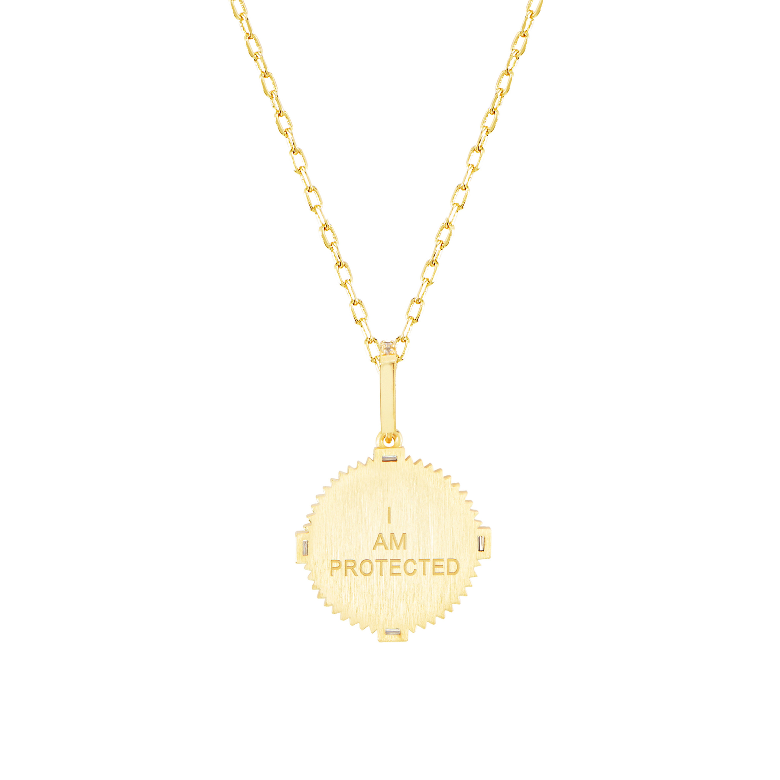 Our 'I Am Protected' necklace will become your very own Celeste Starre saviour, as the black onyx pendant and evil eye design help to attract spiritual guidance and protection. Perfectly worn for any occasion, the engraved mantra will use the power of I Am in helping you manifest your dreams and keep you grounded. Layer with our 'I Am Strong' necklace for a Starre-studded duo.