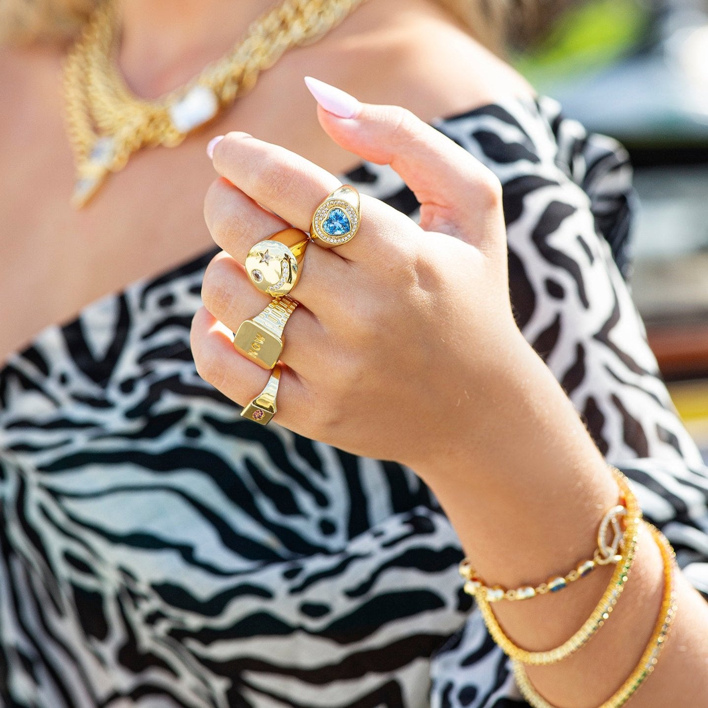 Our 'Queen Of Hearts' ring is sure to become the innermost part of your Celeste Starre jewellery collection. The aquamarine coloured stone will encourage serenity and harmony whenever you wear it. Pair with our 'Eye Twinkle' bracelet and 'Catherine The Great' ring for a look that you will truly treasure.