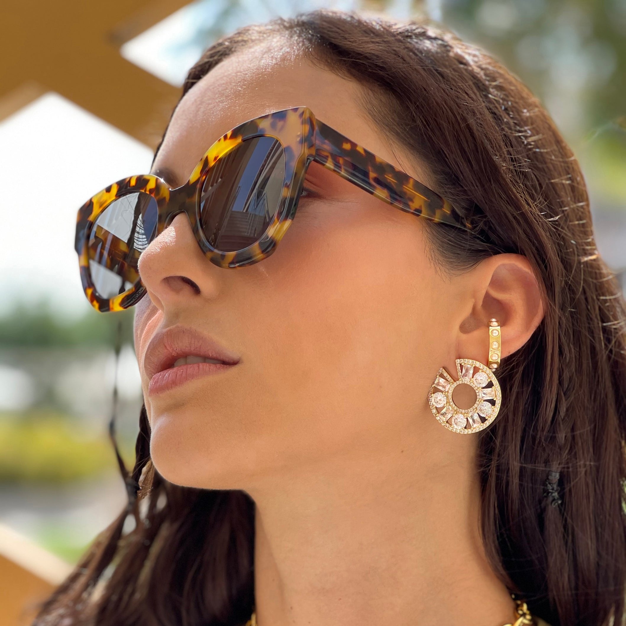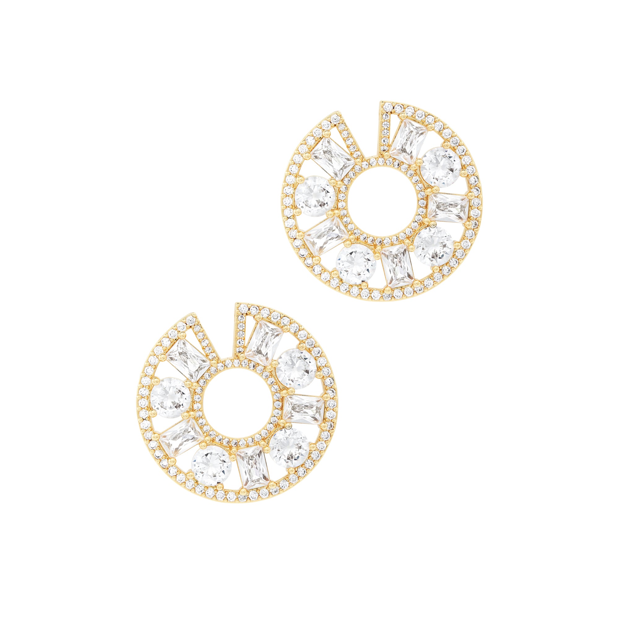 - Circular earring design with crystal details