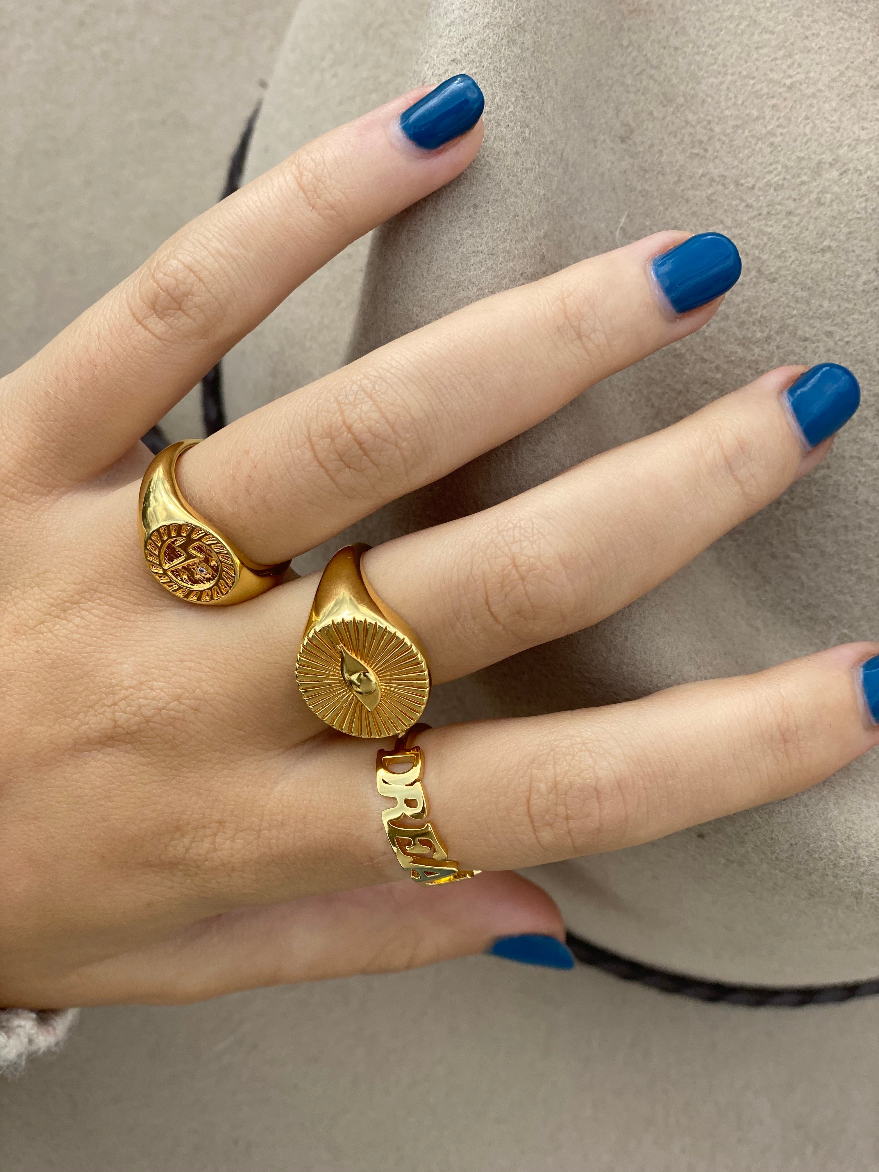 The 'Stormy Night' ring is the ideal piece for all the gold lovers out there. It will stand out magnificently on your hand alongside other Celeste Starre pieces, such as 'The Santorini' ring. Our colourful pendant necklaces, such as the 'Double Struck' and 'Notre-Dame', will also bring out the best in this ring.