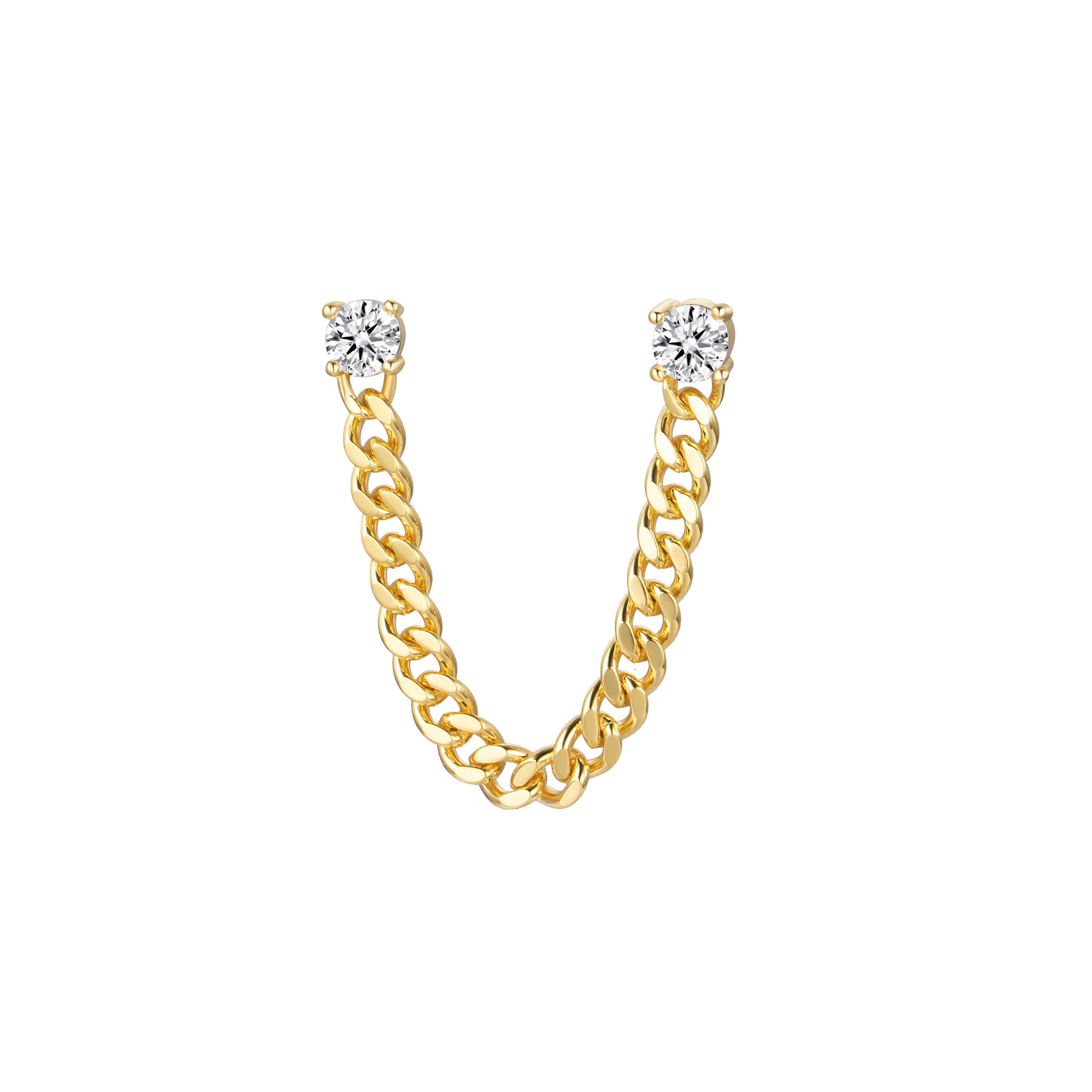 'The Cheryl' is an elegant double earring for any occasion. As the thick golden chain connects one piercing to another, you will feel ready to take on whatever the day has to throw at you! Loop from your first to your second, or from your second to your cartilage - the possibilities are endless. Wear with a Celeste Starre choker to finish off the look perfectly, we love to pair 'The Cheryl' with our 'Protect Me Always' necklace.