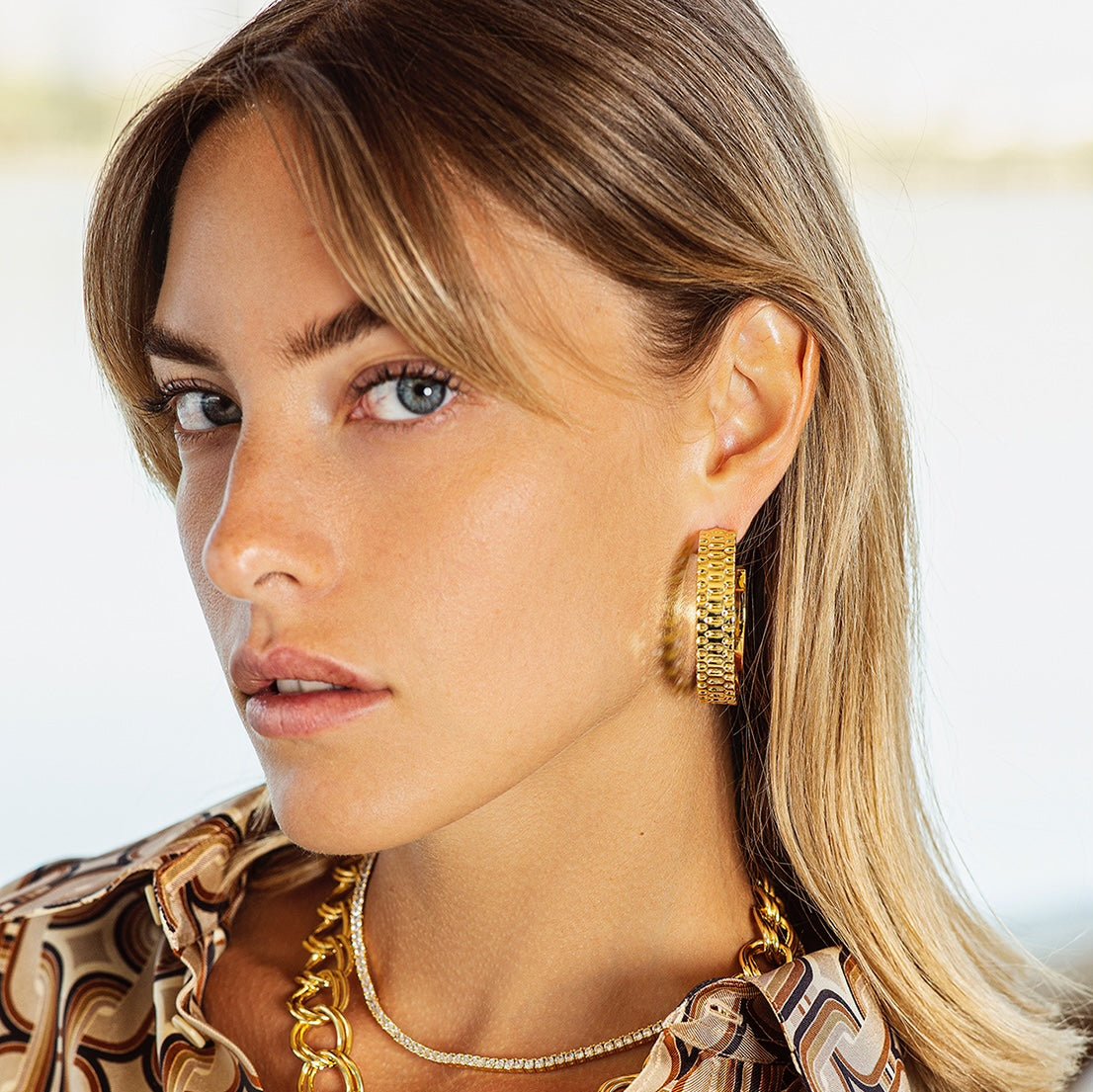 A pair of hoops that will make you shine the brightest in any room, our 'Watch Me Shine' earrings are perfectly suited to your every need. Great for dressing up your favourite day-to-day jeans, or wearing to a special dinner, these hoops are suited to every occasion. Wear with our 'Peace Out' earrings in a second hole and top off your ear stack with the 'Fire And Ice' cuff for the ultimate Celeste Starre trio.