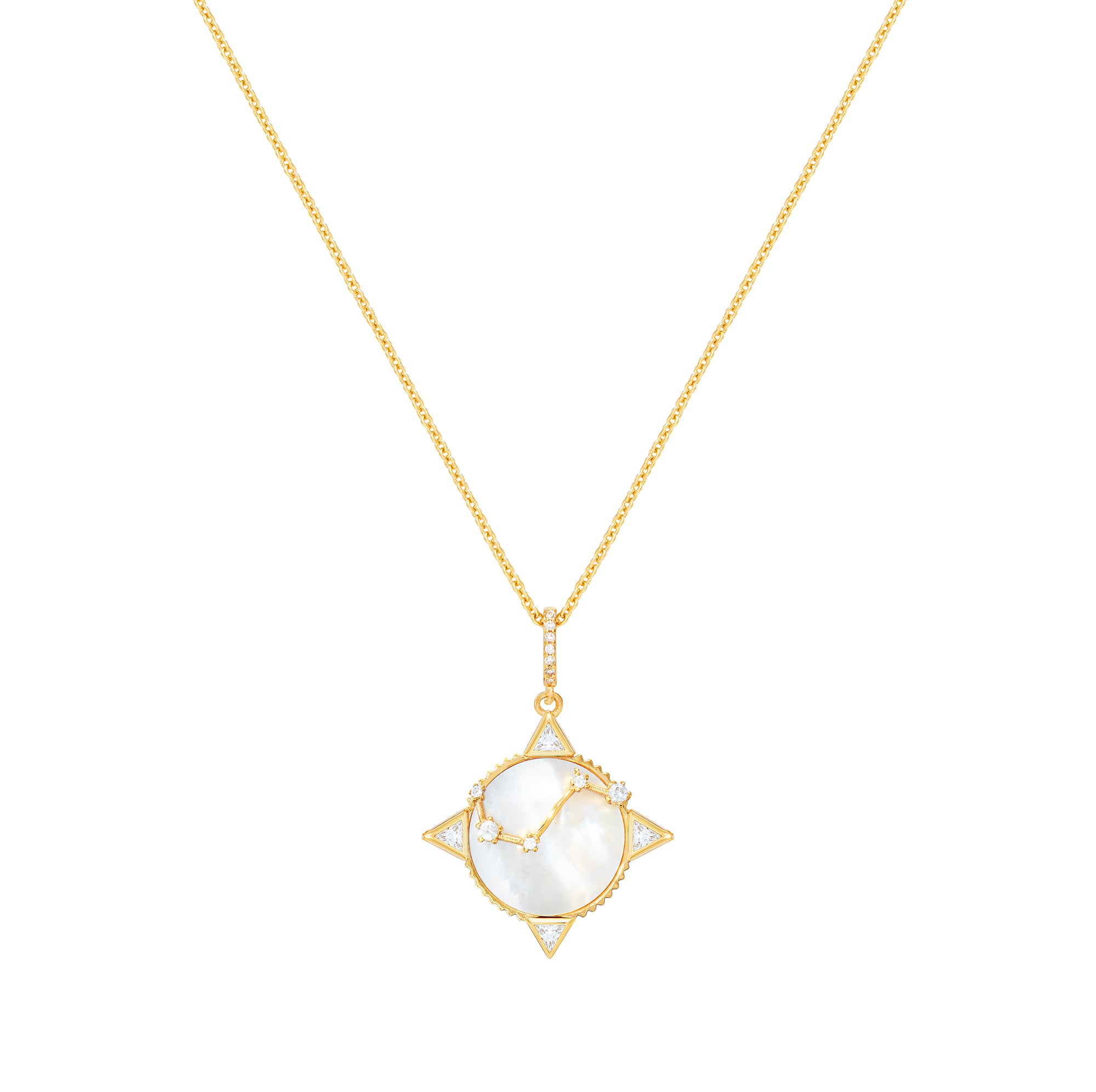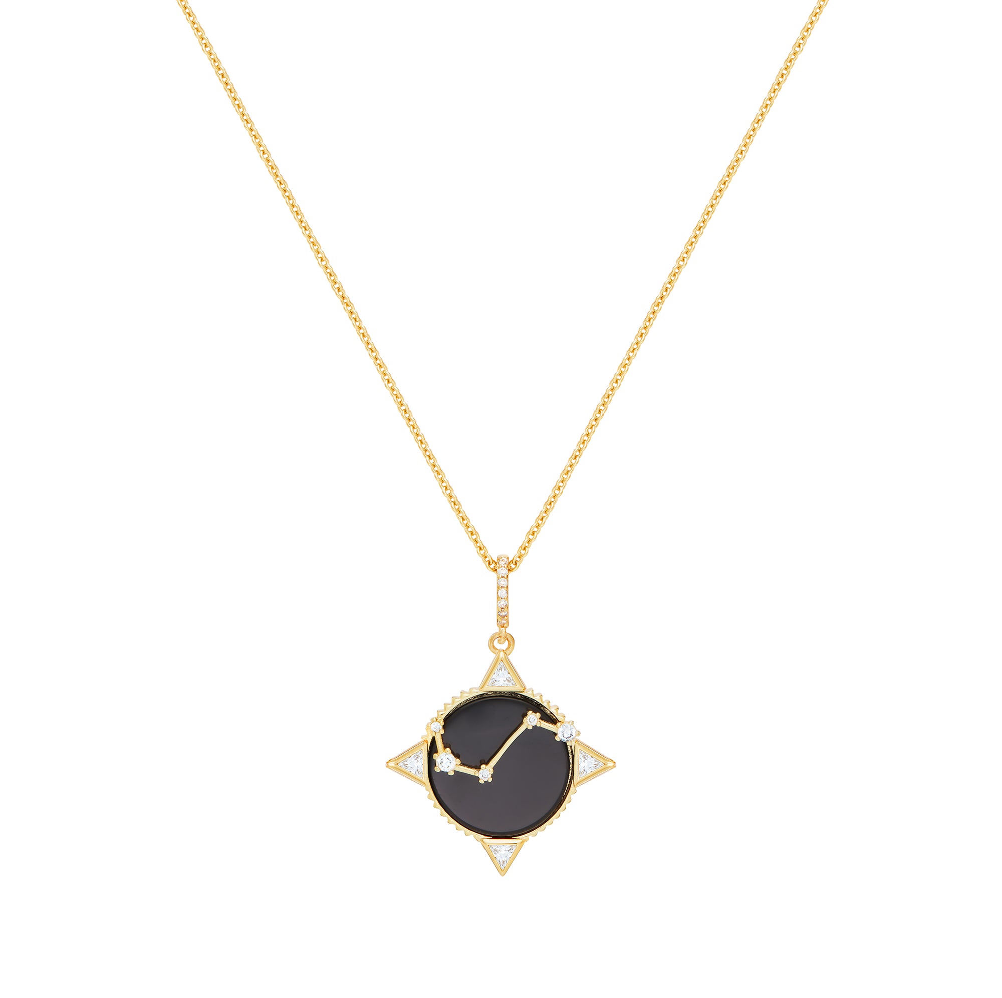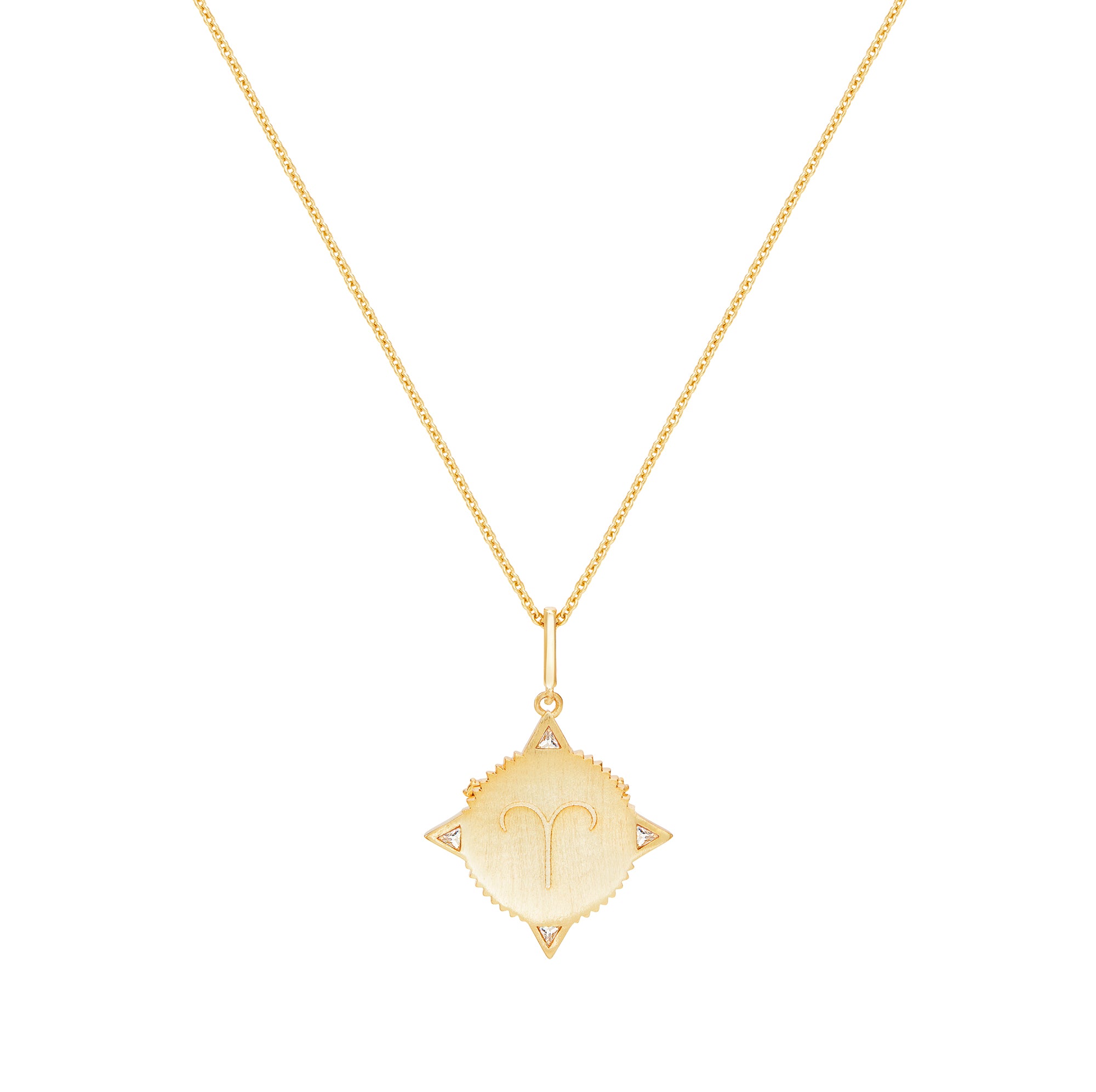 - Dainty necklace design with semi-precious stone pendant, Aries constellation, and zodiac symbol engraved on the reverse
