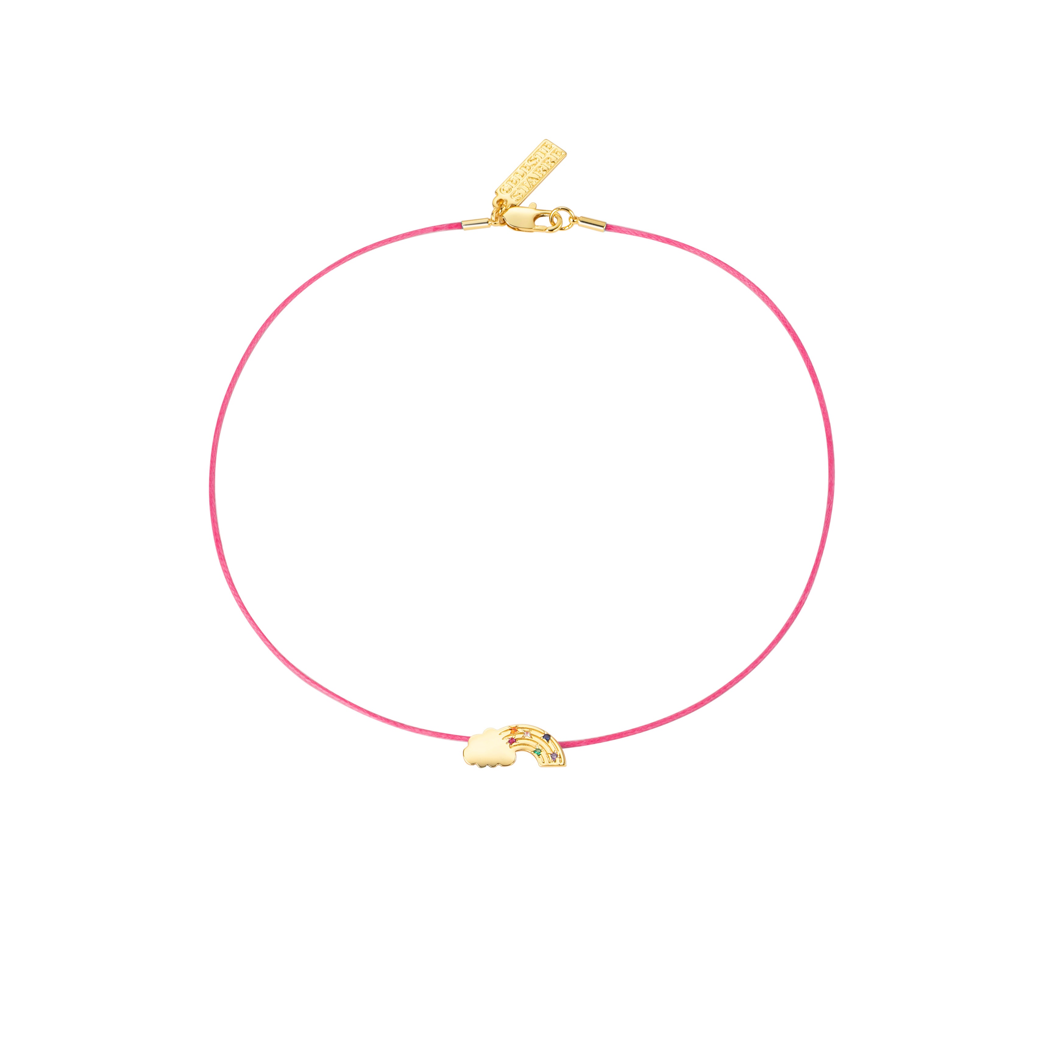 - Pink polyester cord choker with golden rainbow and cloud charm