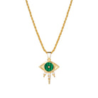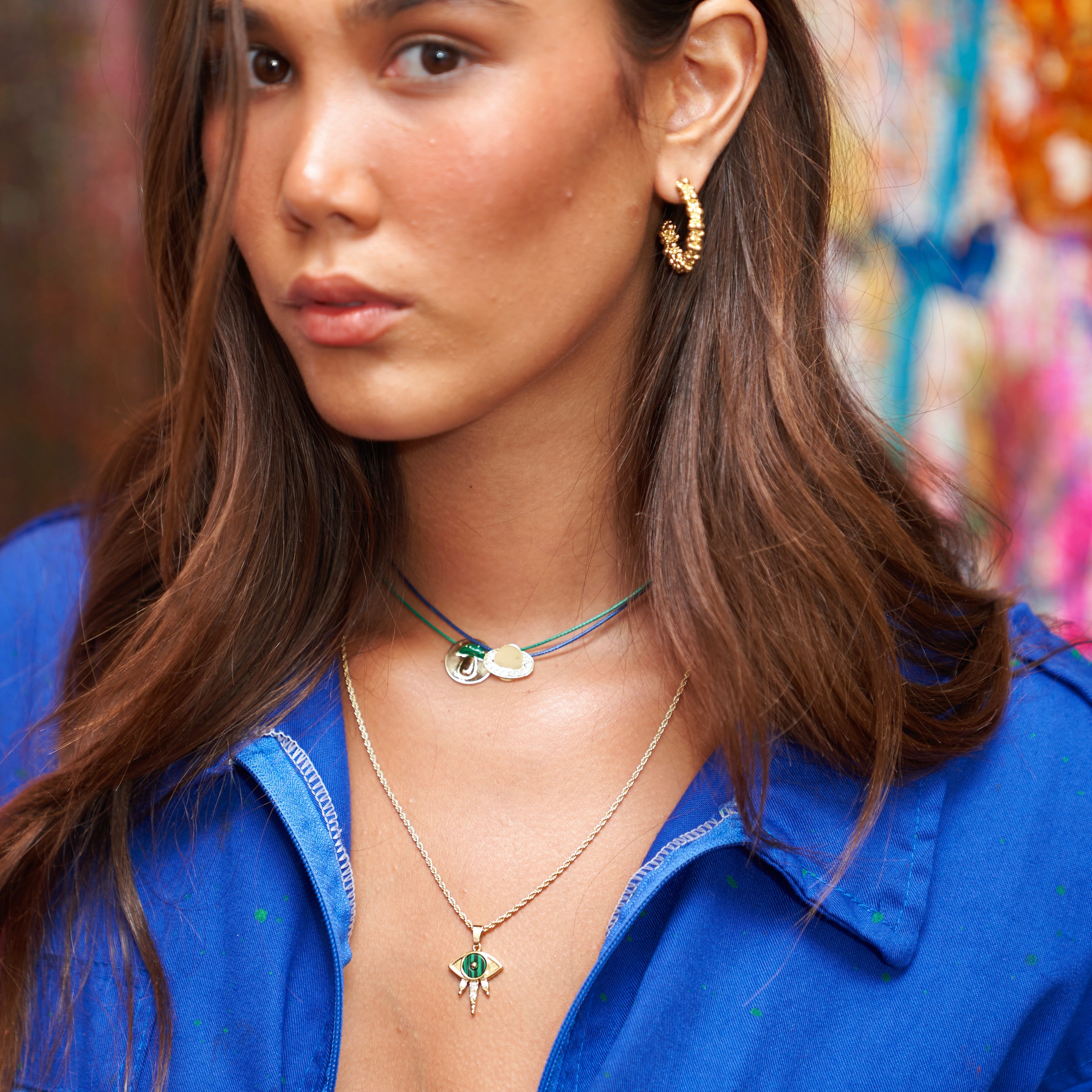 Introducing our 'Give 'Em Daggers' necklace - the ultimate weapon against negative vibes. Featuring a golden eye charm with a malachite stone, this pendant necklace will help you to embrace change with confidence. Don't just wear a necklace, wear a symbol of strength and positivity. Layer with our 'Light Up My Life' necklace to keep the positivity flowing throughout your look.