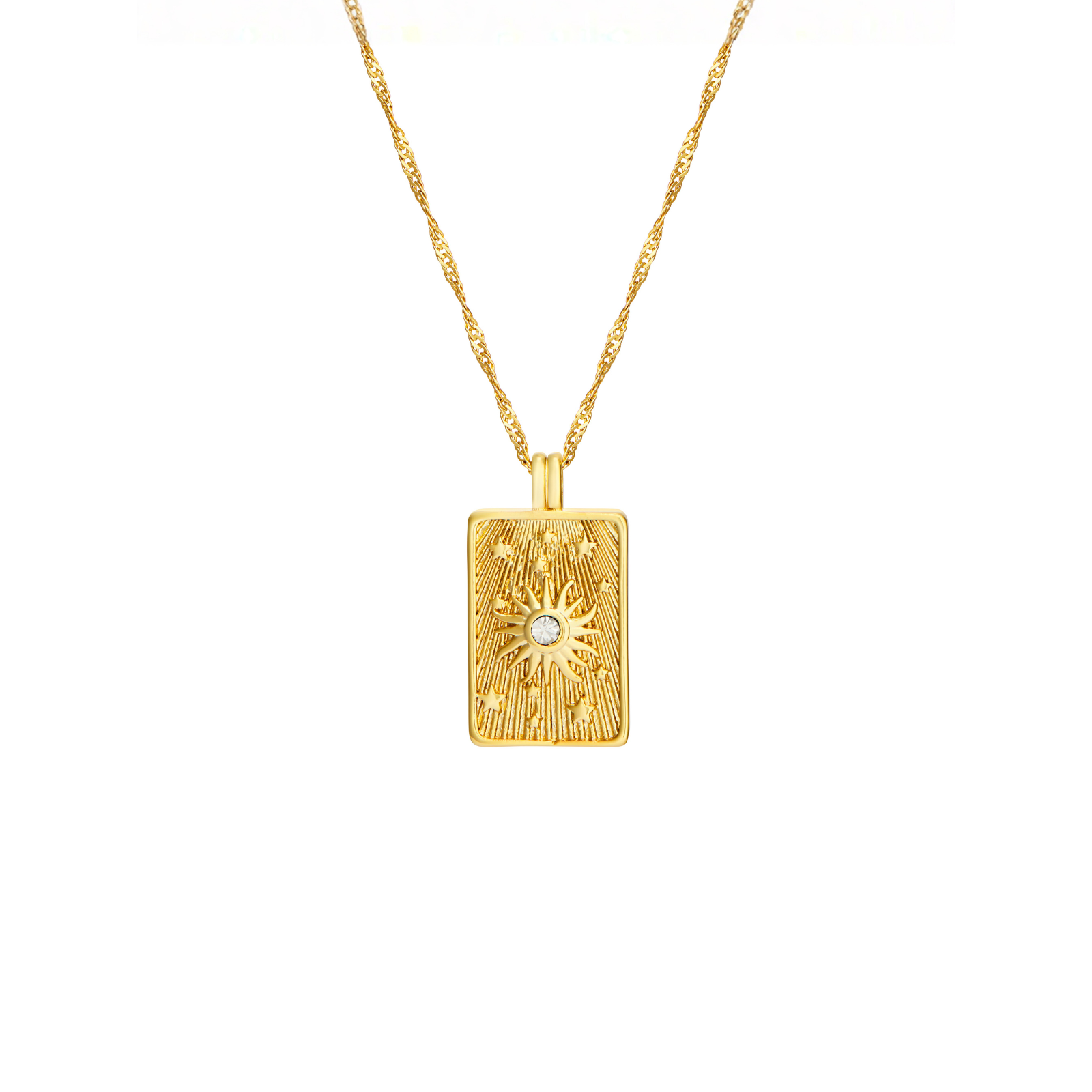 Your sign, but make it gold ✨ The Golden Oracle Pendant is a statement talisman designed to catch the light (and a little bit of destiny). With its vintage-inspired rectangle charm, radiant engraved detailing, and a single sparkling CZ at the centre, this piece gives “old soul” energy with a modern Celeste Starre edge. Wear it when you want your look to feel intentional — like you meant to walk in and steal the room.
