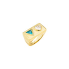 Our Love Triangle Ring is a bold declaration of style and emotion. Set with a sparkling heart-shaped clear CZ and a vibrant blue triangle-cut stone, this geometric stunner is full of contrasts and confidence. Finished in 18k recycled gold, it’s the kind of statement ring that speaks volumes—no words needed.