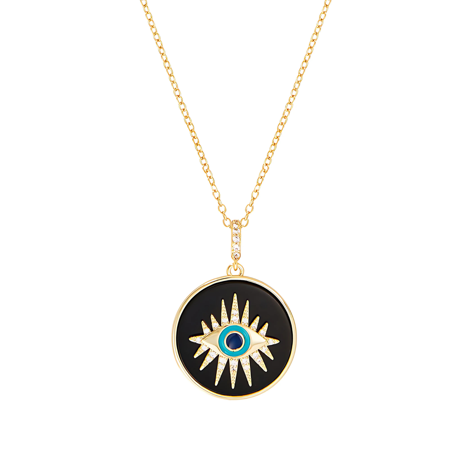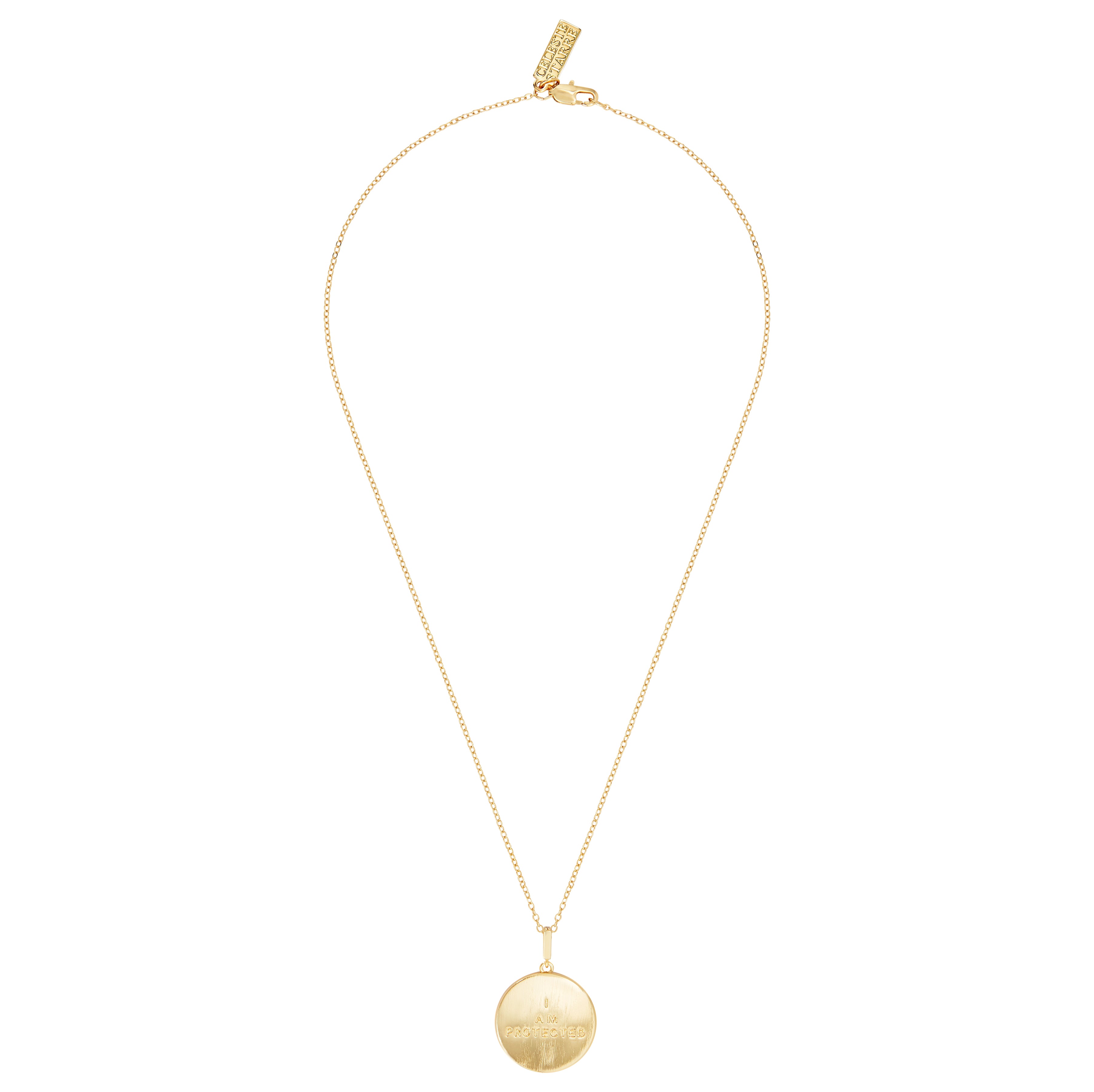 - Delicate necklace design with black onyx pendant and evil eye detail, and 'I Am Protected' engraved on the reverse