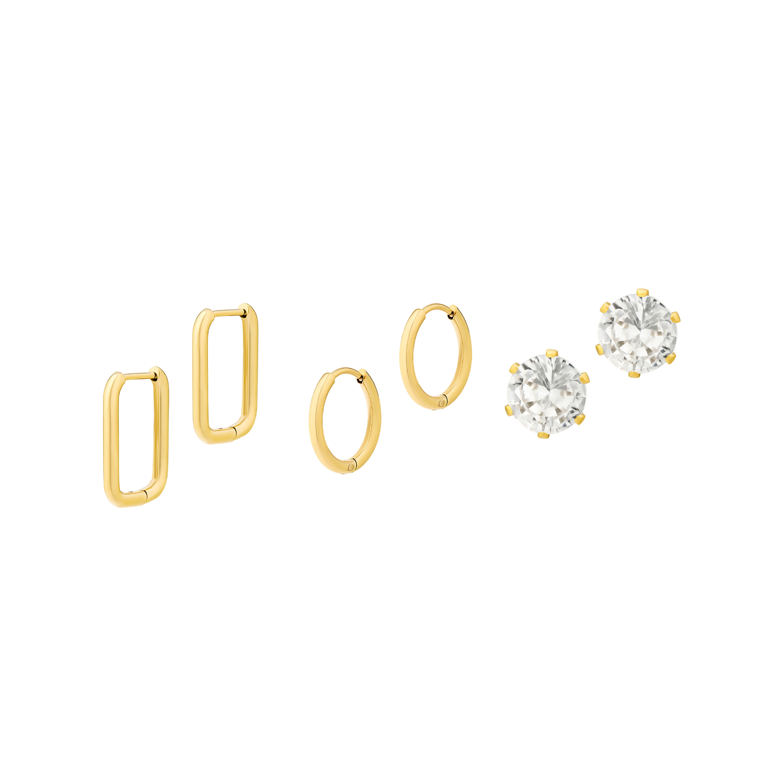 Three essentials, endless styling. The Marsala Set includes a curated trio of gold earrings designed for effortless stacking; a classic stud, a sleek round hoop, and a modern rectangular hoop. Perfect for mixing, matching, or wearing all together for a polished ear stack.