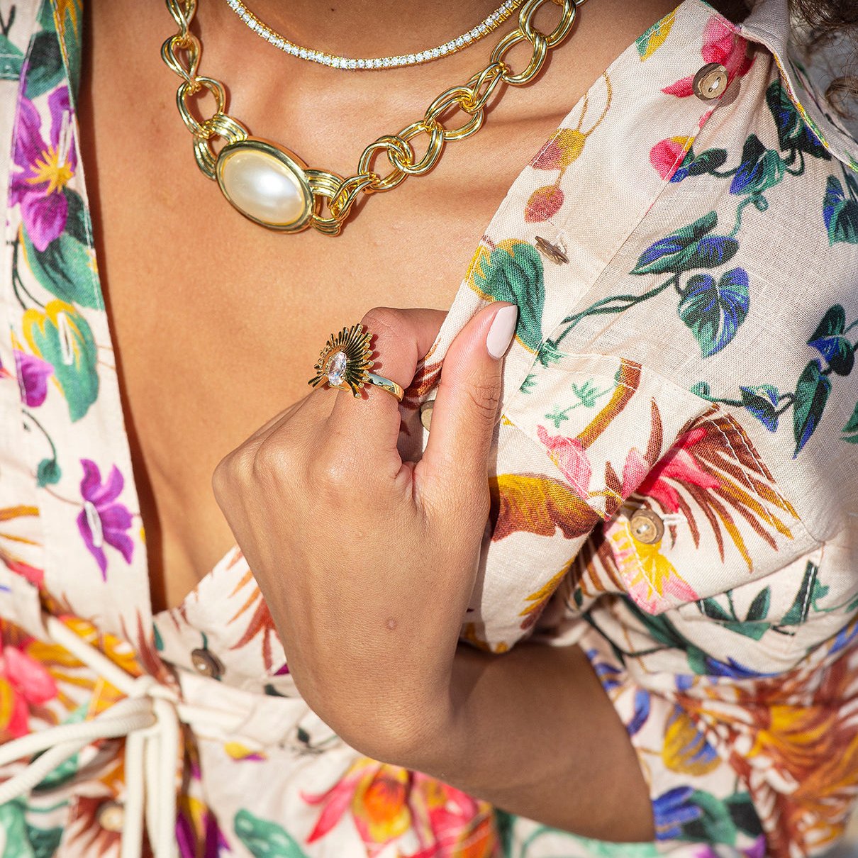 You will always shine bright whenever you wear our 'Sun Goddess' ring. The half sun detail will promote your inner goddess as the crystal at the heart of the sun reflects the light around you. Wear with our 'Peace Out' earrings and 'I Am Free' necklace for a Celeste Starre trio that will help you to feel your best self.