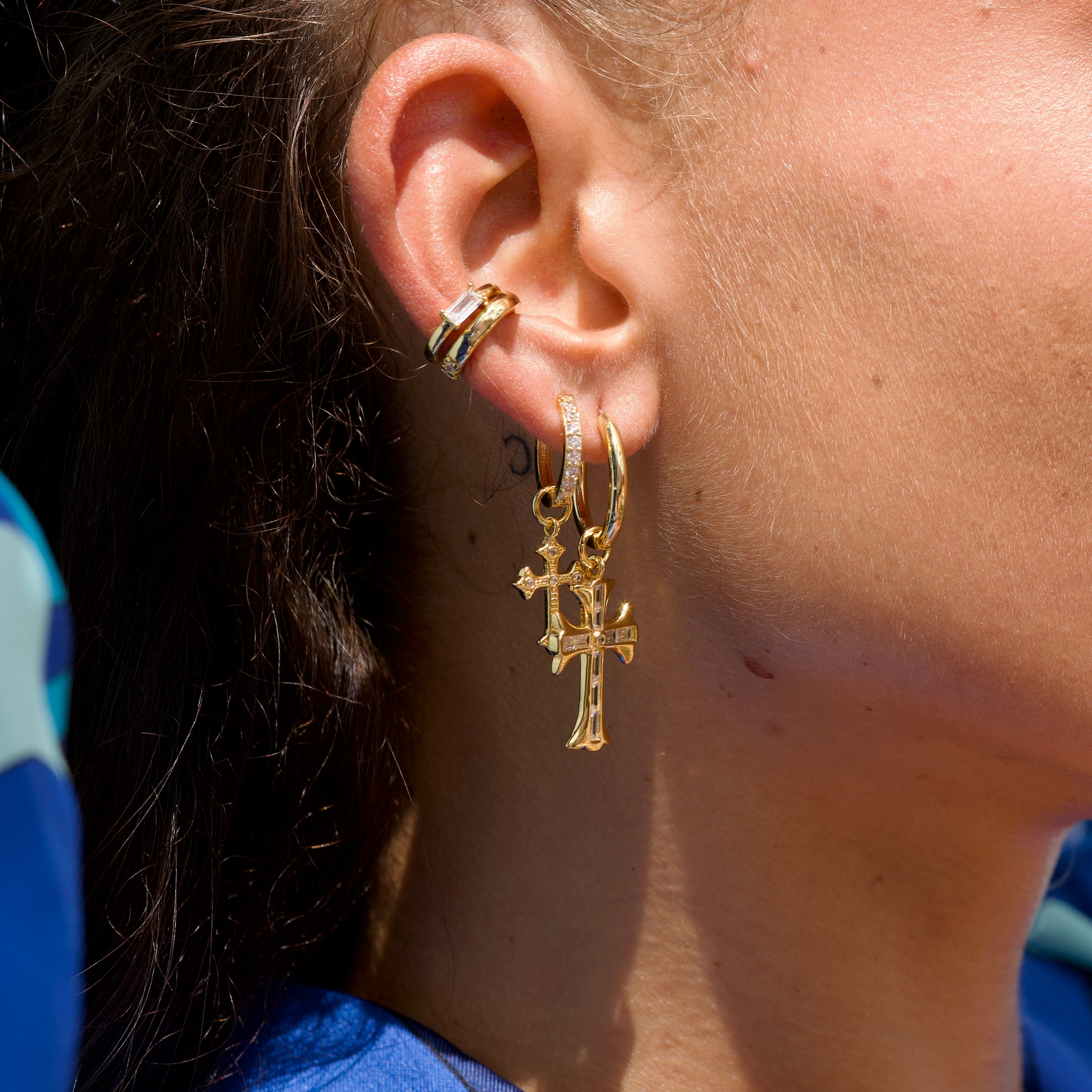 Add a touch of divine style to your look with 'The Duomo' earrings. These sparkling huggie hoops feature a charming cross charm, inspired by the beauty of an Italian cathedral. Elevate your outfit with these heavenly accessories and wear alongside 'The Seville' earrings for a truly sensational Celeste Starre pairing.