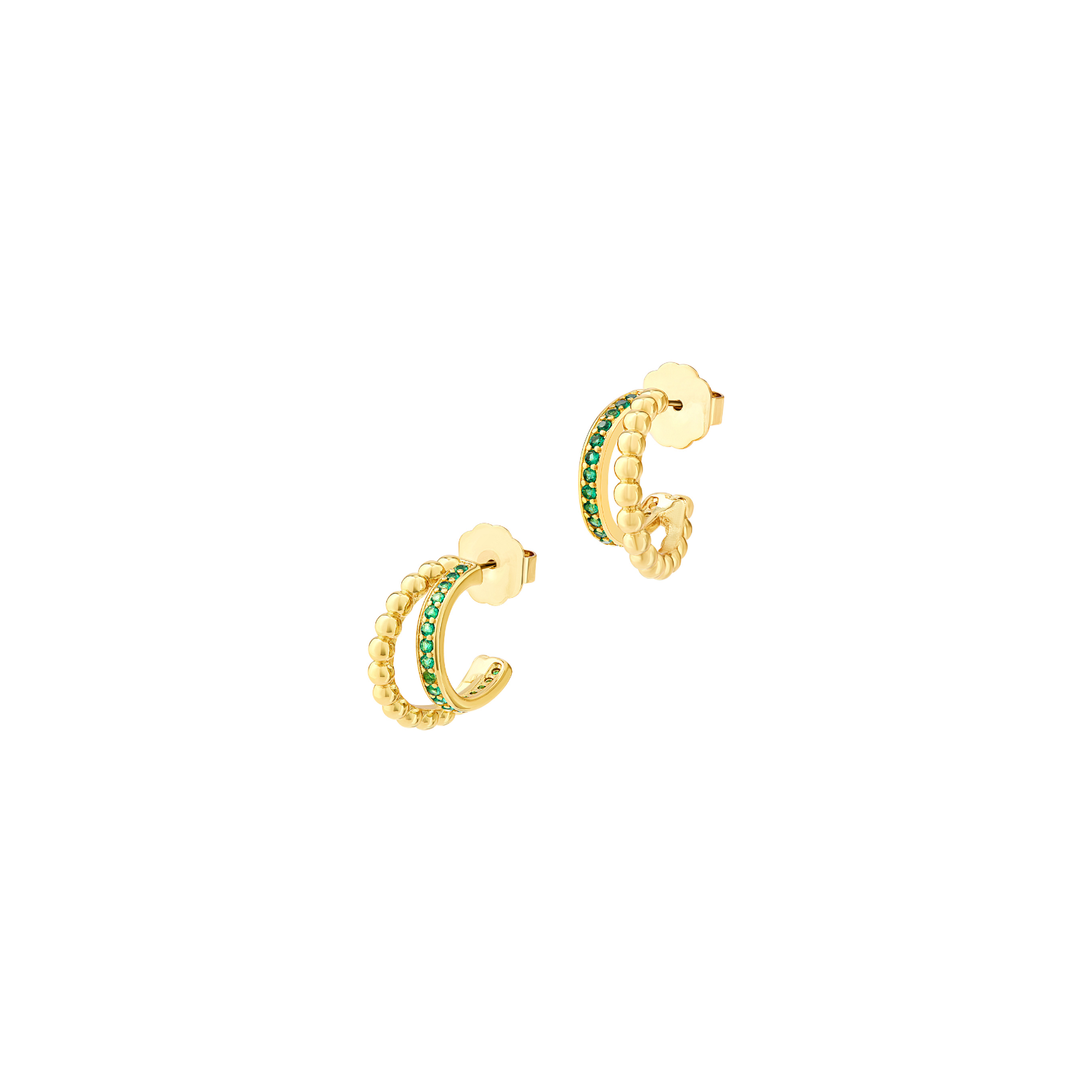 Bold texture meets luminous sparkle. Twilight Spark Hoops are designed to stand out with their sculptural gold bead detailing and a row of shimmering AAA CZ stones that catch the light beautifully. The curved silhouette hugs the ear perfectly while adding volume and character to your look.